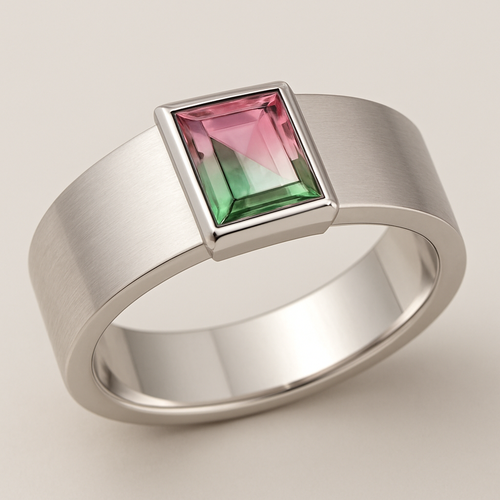 Eckiger Ring 1cm breit mit einem Diamanten in Form eines Trapez in grün und rosa