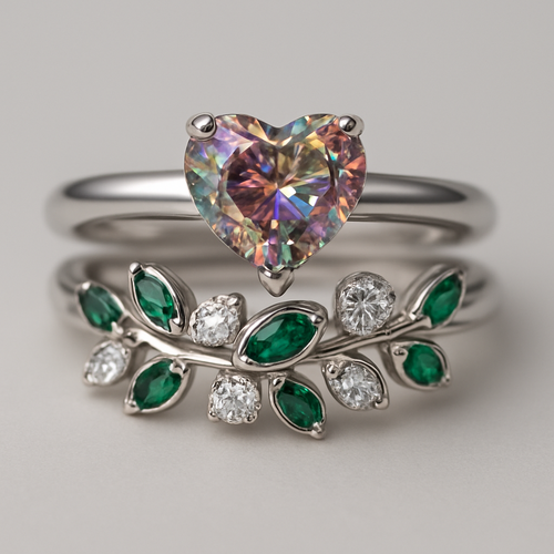 Two 18k white gold bands: first one a 1.5-2 carat heart cut multi color diamond. Second ring as the bottom of the stack,...