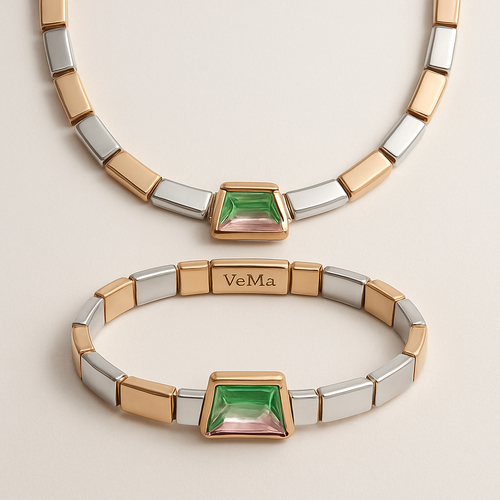 Eckige Kette und Armband 1cm breit in rosé und Silber Front gemischt mit einem Diamanten in Form eines Trapez in grün u...