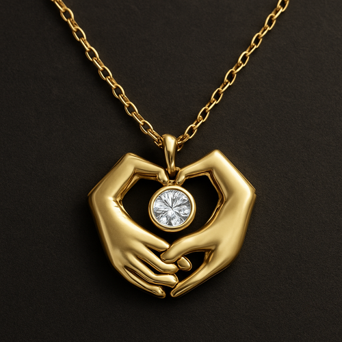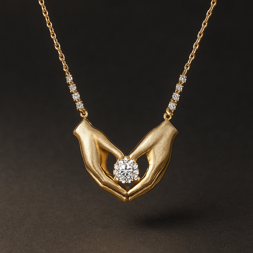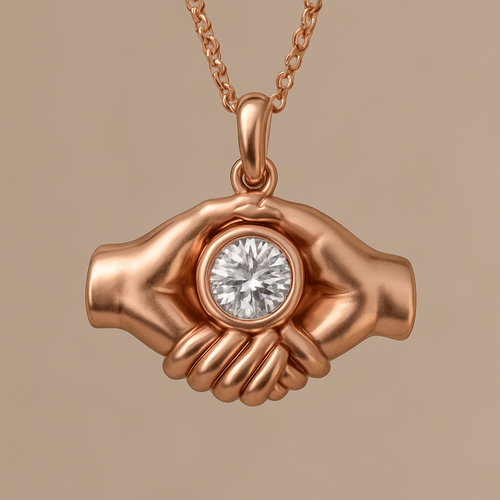 Diamentenkette, 2Hände die sich festhalten als Anhänger und in der Mitte in Rund gefasst ein weißer Diamant in rosé