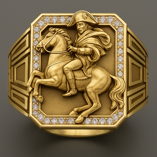 Make a ring with Napoleon riding on his horse in 18k gold and diamonds