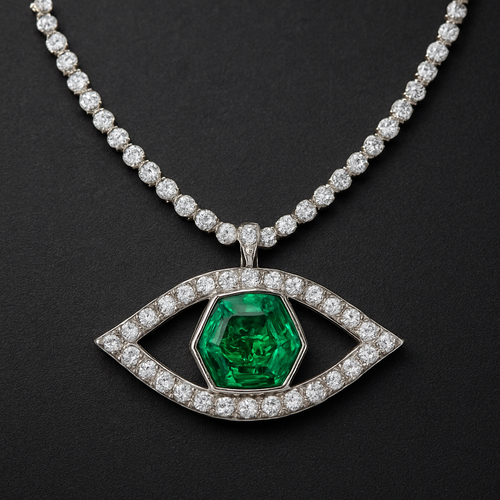 Kette aus Diamenten, Auge als Anhänger und in der Mitte eine Raute der gefasst ein grüner Diamant in Silber