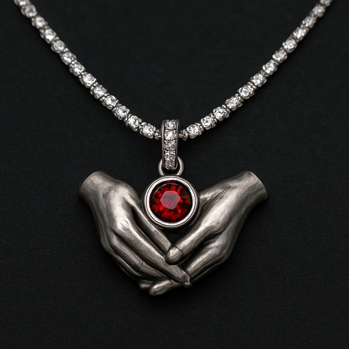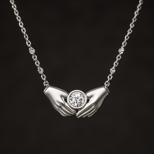 Kette aus Diamenten, 2Hände die sich festhalten als Anhänger und in der Mitte in Rund gefasst ein weißer Diamant in ro...