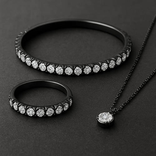 Schwarzes Armband mit feinen weißen Diamanten ca 0,5cm dich mit passendem Ring und Kette