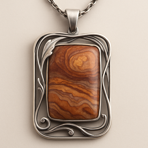 Rectangular jasper cabochon silver pendant art nouveau