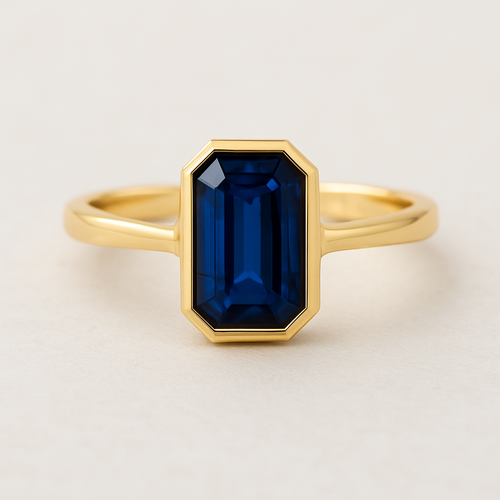 Yellow gold metal, 1.5ct elongated hexagon sapphire center stone, tapered band