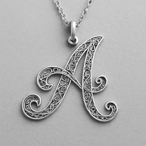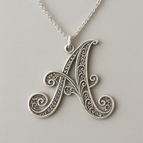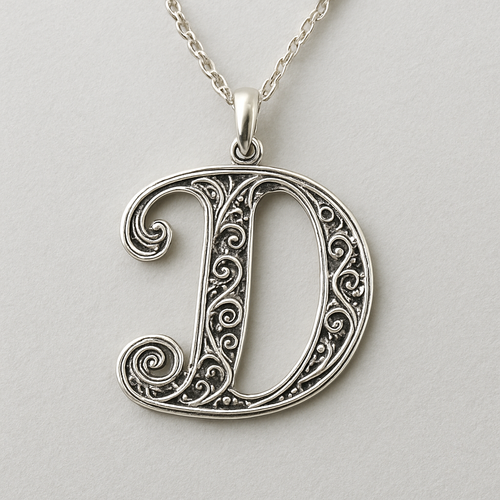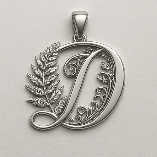 Silver cursive script initial D, add in fern leaves on the D itself with everything else