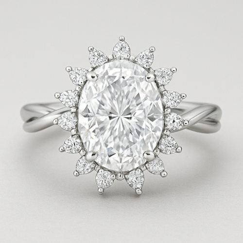 White gold 5 ct Portuguese cut oval diamond sunburst halo ring with twist band