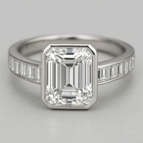 White gold emerald cut diamond ring with bezel set baguettes around the band