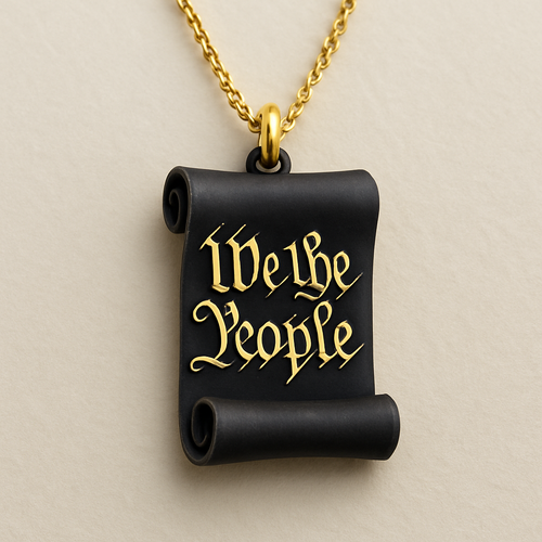 A straw pendant designed to look like the constitution rolled up. Black with gold inlay that says “We the people” in the...