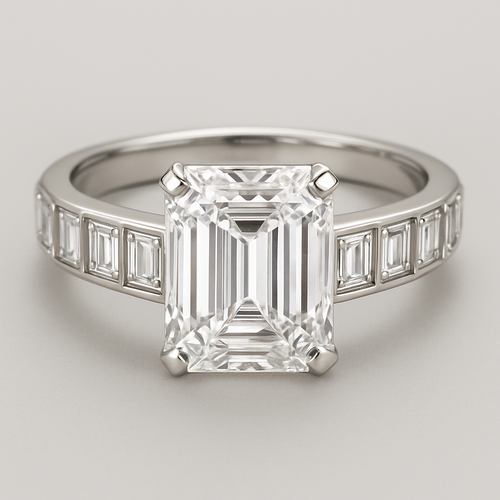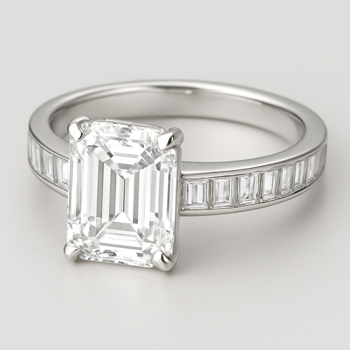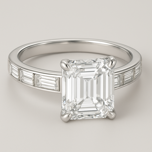 White gold prong set 5ct emerald cut diamond ring with bezel set baguettes long ways around the band