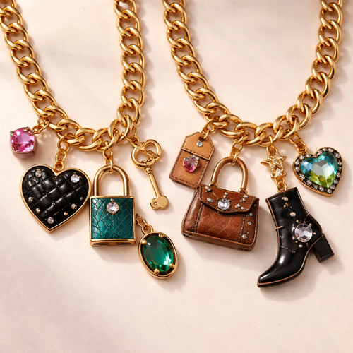 Create charm necklaces with leather inspired charms, with color crystals, with thick chains