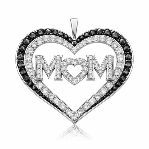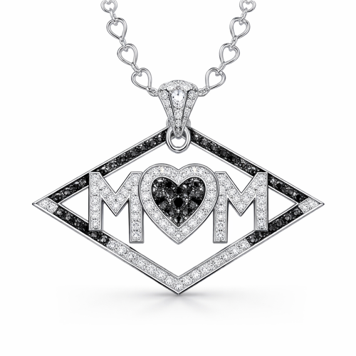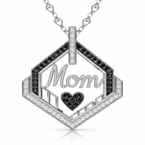 Geomatric architecture pendant with heart chainshape written of mom with black and white diamonds of white background