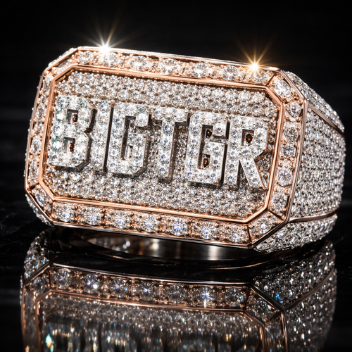 Ultra realistic iced out hip hop diamond ring, oversized rectangular top plate in big pointer diamonds , polished rose g...