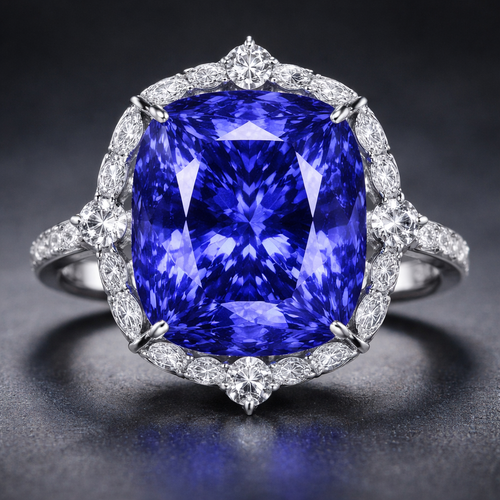 draw a 20 carat tanzanite ring with 4 round diamonds 1 at each point of 12 o clock, 3, 6 and 9 o clock positions followe...