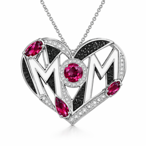 Gemoatric archtictyre pendant of heart shape with written mom in abstract way of white and black and ruby diamonds of wh...