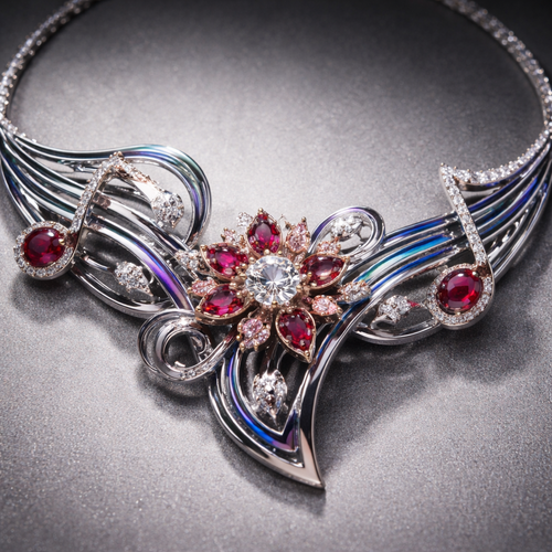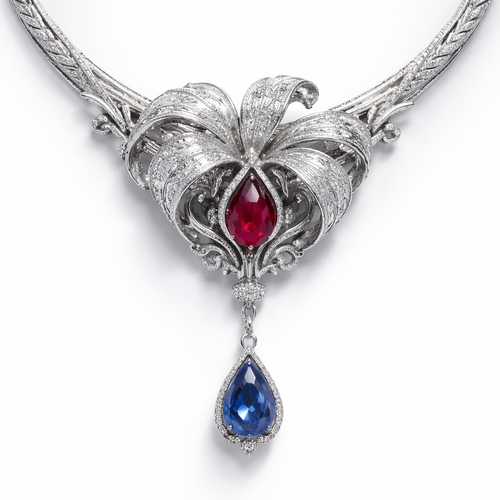 the middle of necklace with a flower with curved edges, curling under and a red ruby placed underneath where they’re in ...