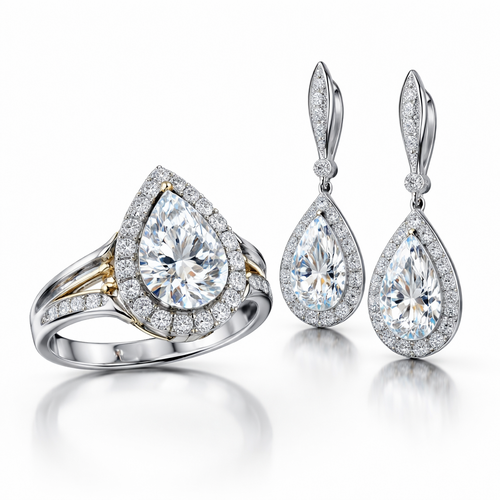 Pear shape, main pearl diamond no surrounding diamond but the ring with uneven shapes