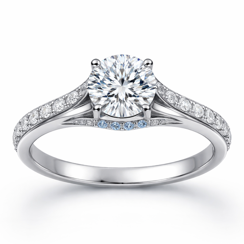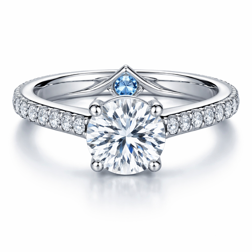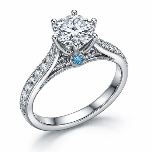 platinum, round diamond with smaller ones on the band, in a cathedral setting, guard rail, light blue sapphire peakaboo