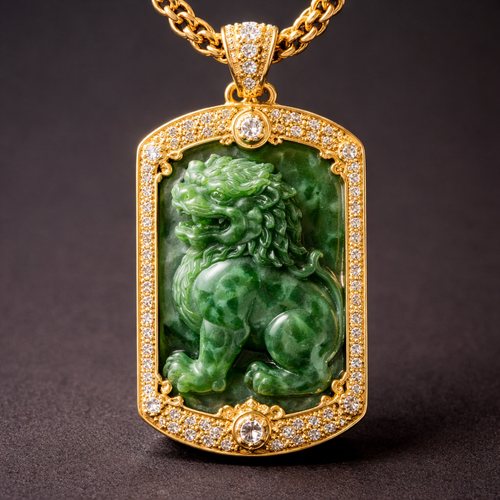 A dog tag Jade foo dog mounted with 22 karat gold and diamonds in the gold as a pendant on a chain