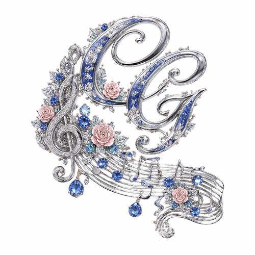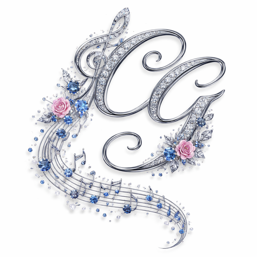 The letter C ave G in calligraphy with the music note and a stream of music notes and small roses diamonds blue sapphir...