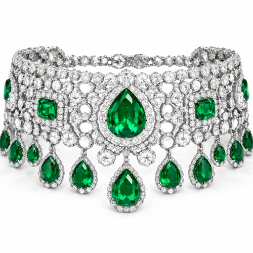 Rose cut & full cut round and fancy diamond choker come bracelet with green emeralds