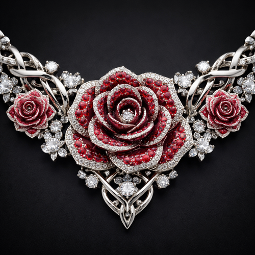 A rose with red rubies diamonds three strands silver with red rubies on the end a Necklace