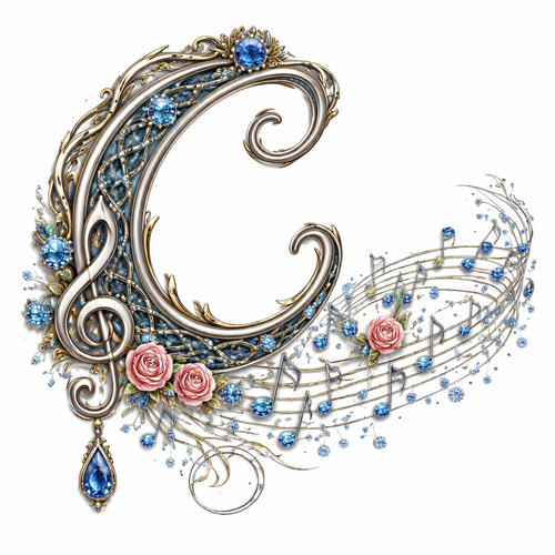 The letter C in calligraphy with the music note and a stream of music notes and small roses diamonds blue sapphires