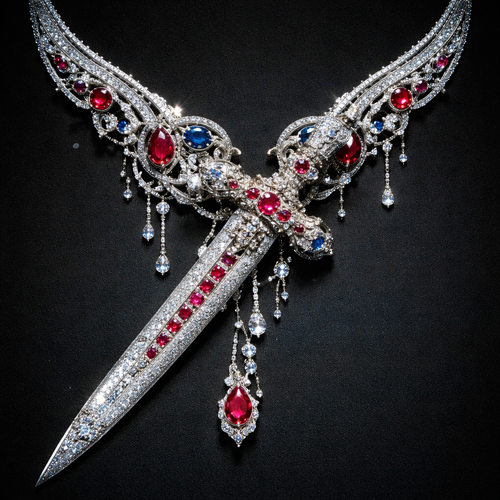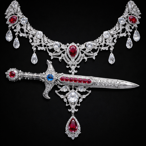A Viking sword sideways, diamonds, red rubies, couple sapphires, silver, and a diamond necklace