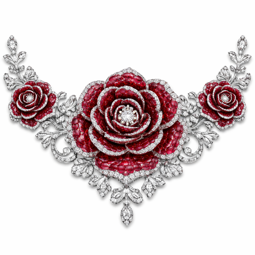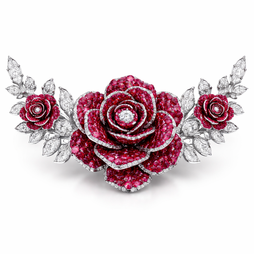 A rose with red rubies diamonds a mother set of small roses on each side diamonds in between