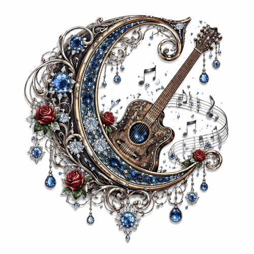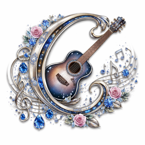 The letter C ave in calligraphy with a guitar with the music note and a stream of music notes and small roses diamonds...