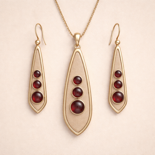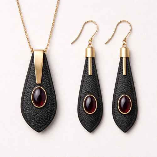 Create minimalistic pendant and earrings with leather design and few cabochon garnets