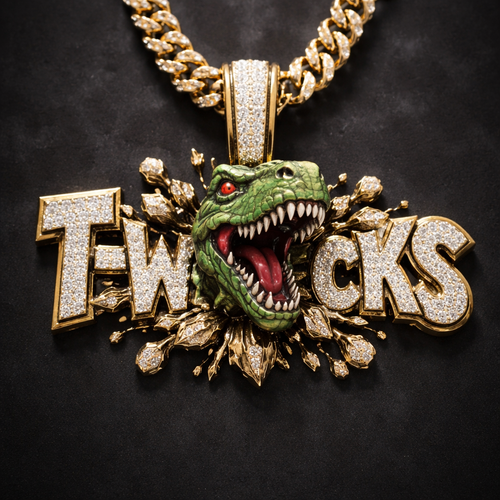 A pendent that says t-wrecks with a t wrecks bursting out the middle of it but bursting out like the name it self and t...