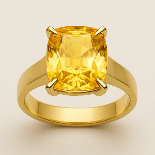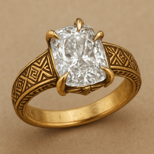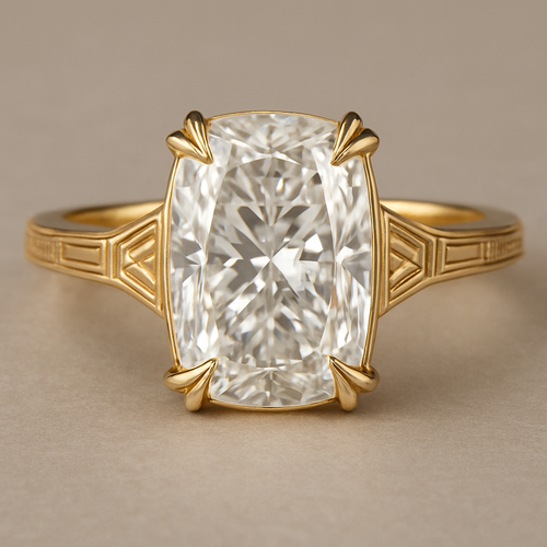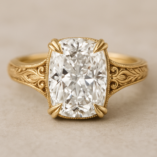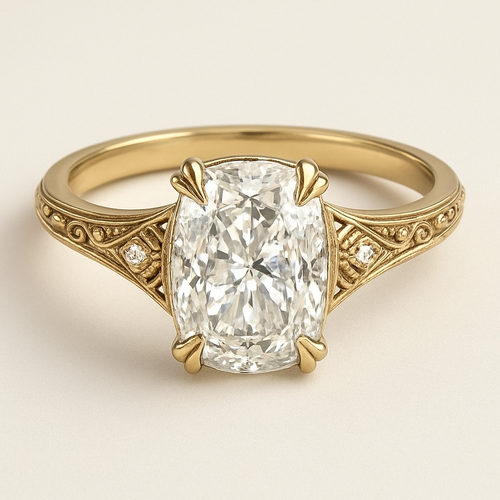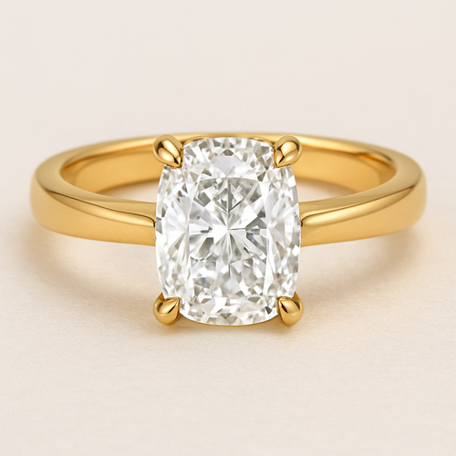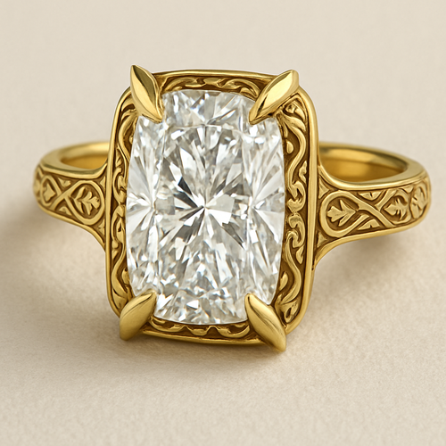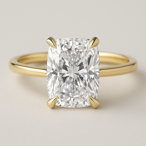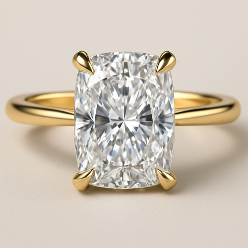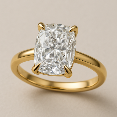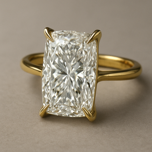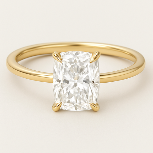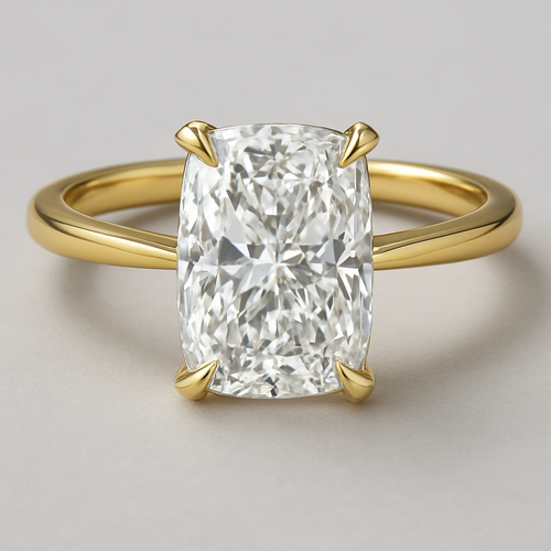 Elongated cushion diamond in yellow gold with Talon prongs at north south east and west Talon prongs