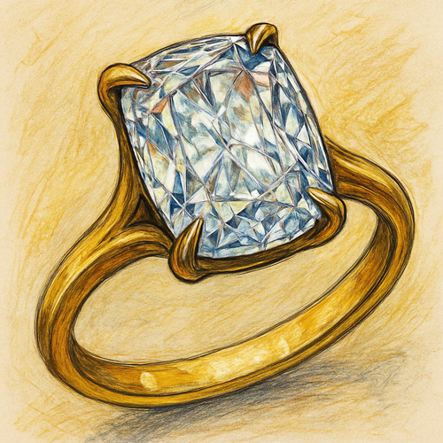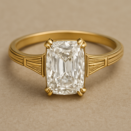 Elongated cushion, cut diamond set in yellow gold band, taping with Talon prongs