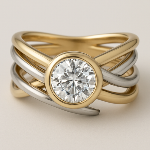 Ring with thick intertwining bands of yellow gold and white gold with a 2 karat bezel set cushion cut center diamond