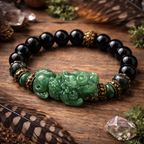 Green jade pixiu with black onyx stretchy bracelet