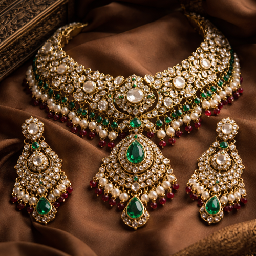 Create jewelry set for Brahmin with gemstones an leather design texture, in gold