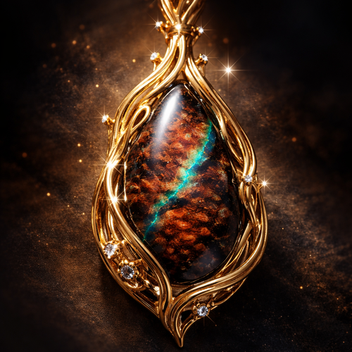 Mythological teardrop pendant inspired by ancient earth and celestial light. Featuring a dark matrix opal with deep red...