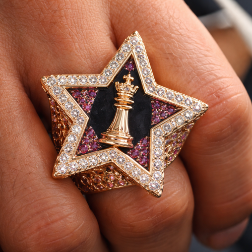 I want a big pinky ring in a star shape with the middle being a chess piece king
