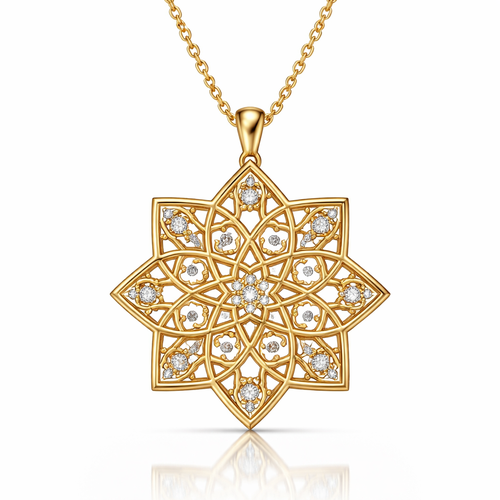 Minimalist luxury pendant necklace, Moroccan zellige geometric pattern, gold plated, white background, product photograp...