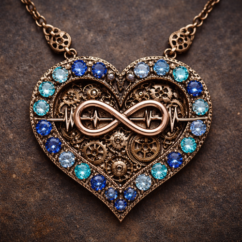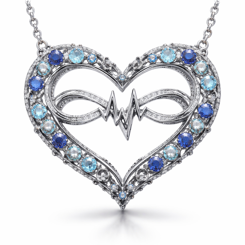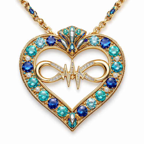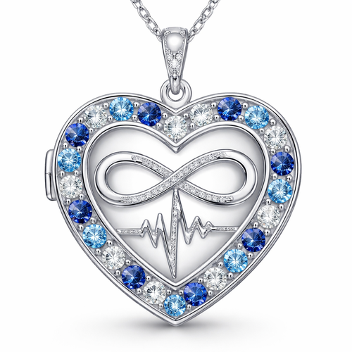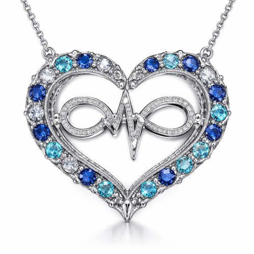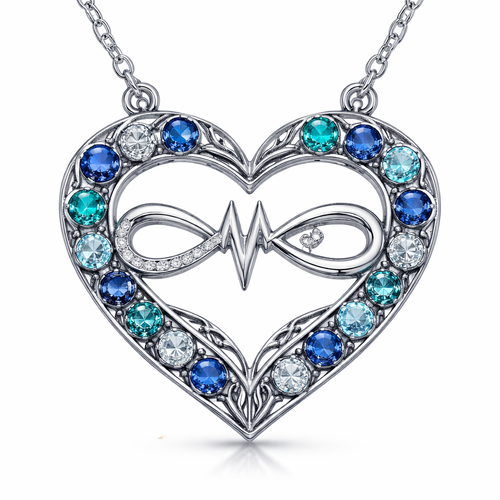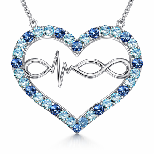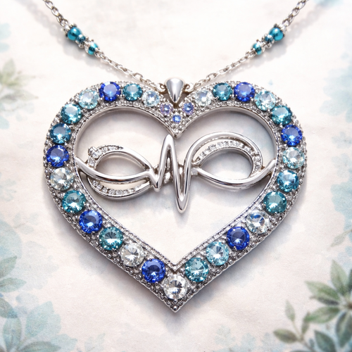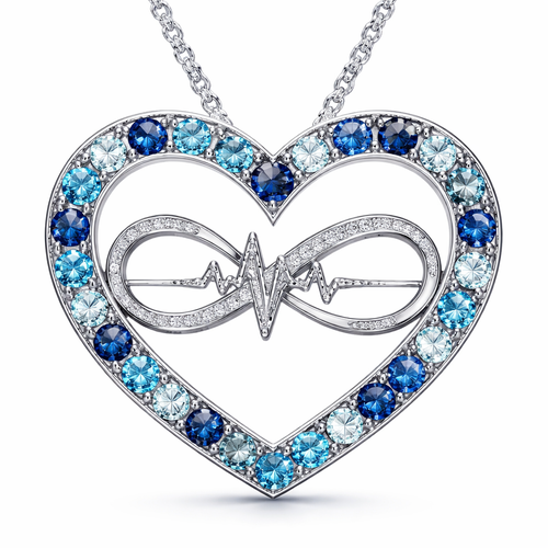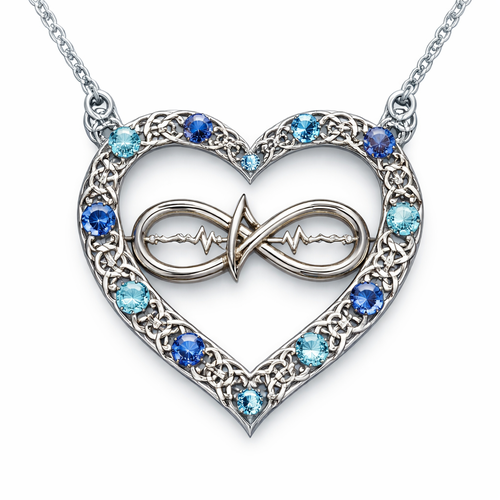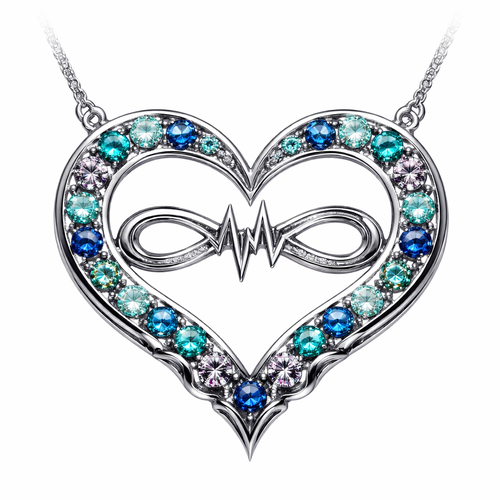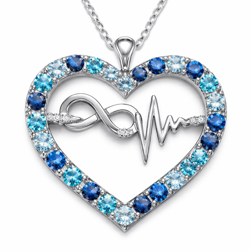 A heart necklace with the infinity symbol and heartbeat wave with alternating September, December and March birthstones ...