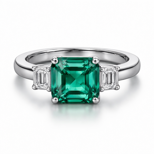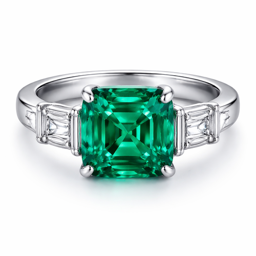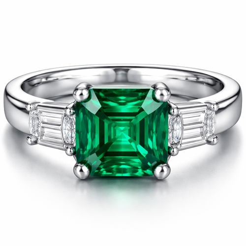 Modern Asscher cut emerald ring set in platinum with two horizontal emerald cut diamonds on each flank