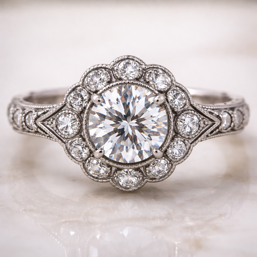 I need a vintage ring with a halo and diamonds on shank