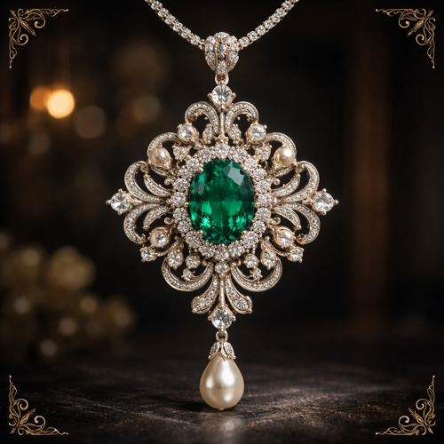 Necklace diamond round with one big Smaragd Emarald green