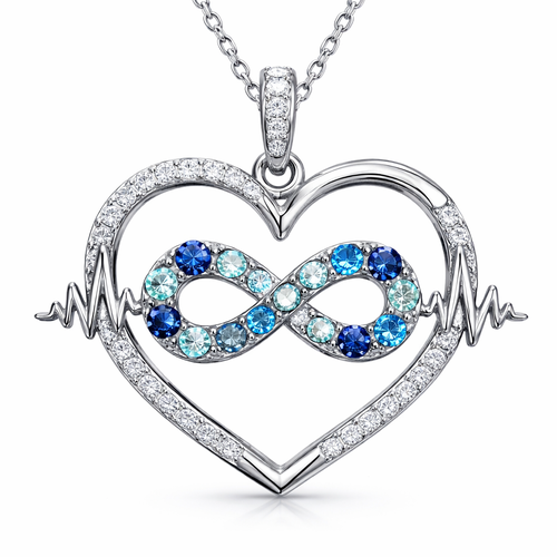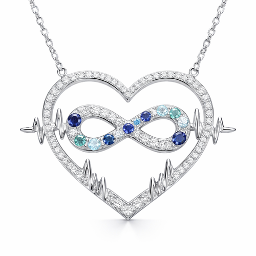 A heart necklace with the infinity symbol with alternating September, December and March birthstones in the infinity sym...