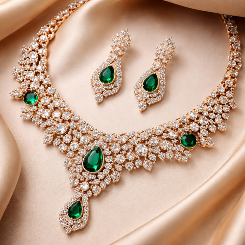 Create pendant earrings and bracelet with leather design and gemstones in gold