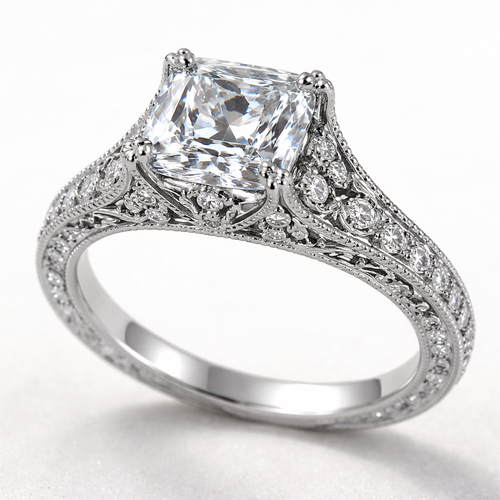 I want a ascher cut diamond ring with diamond accents on the band with a crown cathedral
