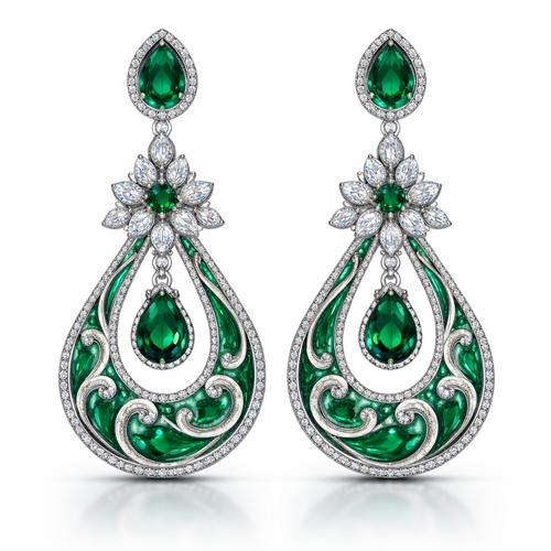 A stunning pair of gold chandelier earrings laid flat on a polished black marble surface, shot from directly above in a ...