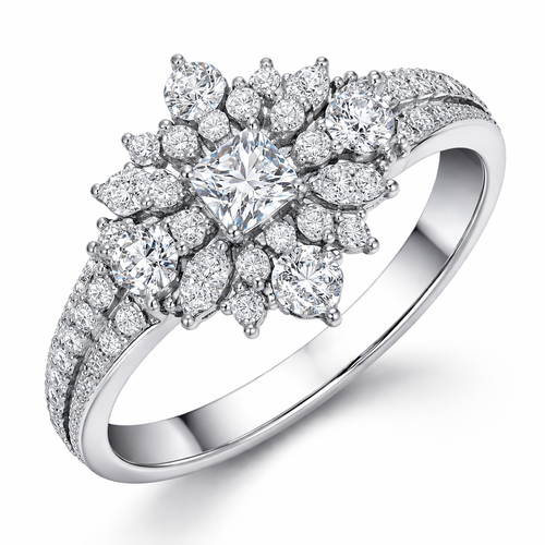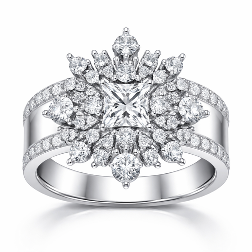 Bague type bandeau en or blanc, avec les diamants disposés façon flocon. Diamants à utiliser : un de taille princesse, d...